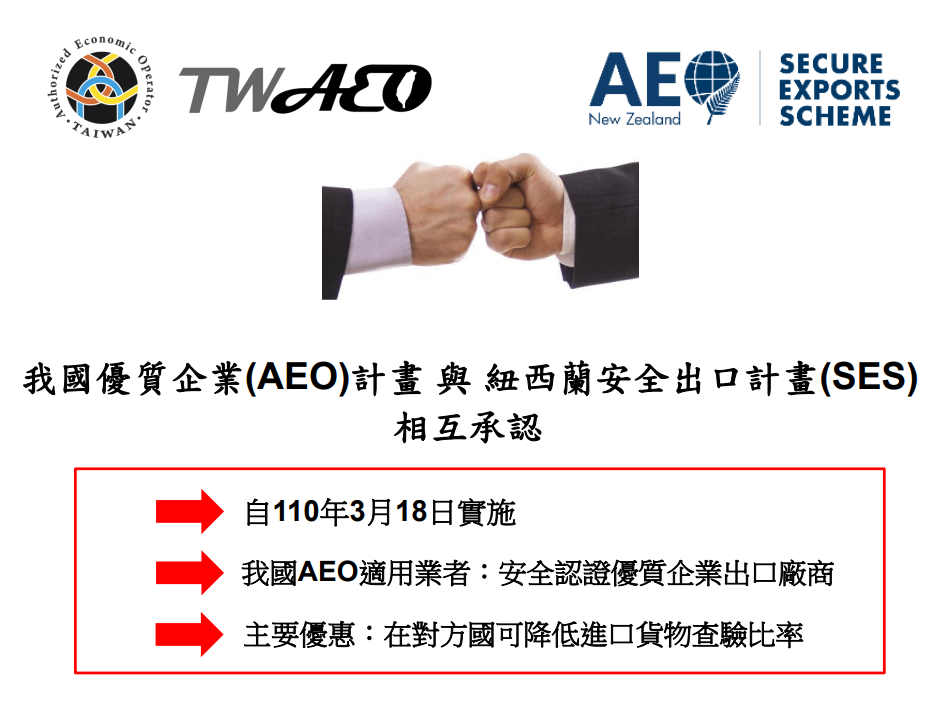 臺灣先前已分別與美國、日本、韓國、新加坡、澳大利亞、印度、以色列7國完成簽署AEO相互承認協議,近日關務署亦發佈與紐西蘭安全出口計畫(Secure Exports Scheme,SES)之相互認證協議已完成簽署。本公司亦為臺紐雙方AEO/SES交換名單之業者,除可享有與紐西蘭安全出口計畫業者降低進口貨物文件審查及(或)貨物查驗比率,若進口貨物被紐國抽中查驗時,亦得優先查驗等優惠外,另可強化整體供應鏈安全及提升全球跨境商貿活動之安全。